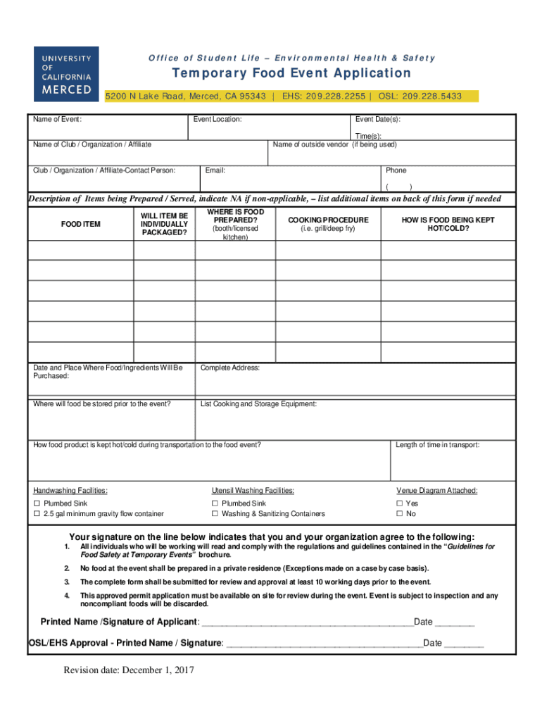 Of fic e of S tu d e nt Life E nvi r o n me n ta l He al t h & Sa fe tyTemporary Food Event Application 5200 N Lake Road, Merced, CA 95343 | EHS: 209.228.2255 | OSL: 209.228.5433 Name of Event:Event