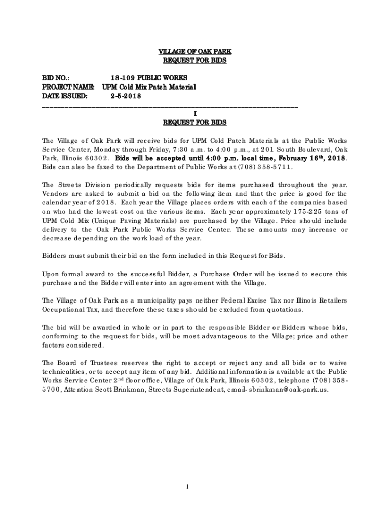 VILLAGE OF OAK PARK REQUEST FOR BIDS BID NO.: 18109 PUBLIC WORKS PROJECT NAME: UPMC old Mix Patch Material DATE ISSUED: 252018 ___ I REQUEST FOR BIDS The Village of Oak Park will receive bids for