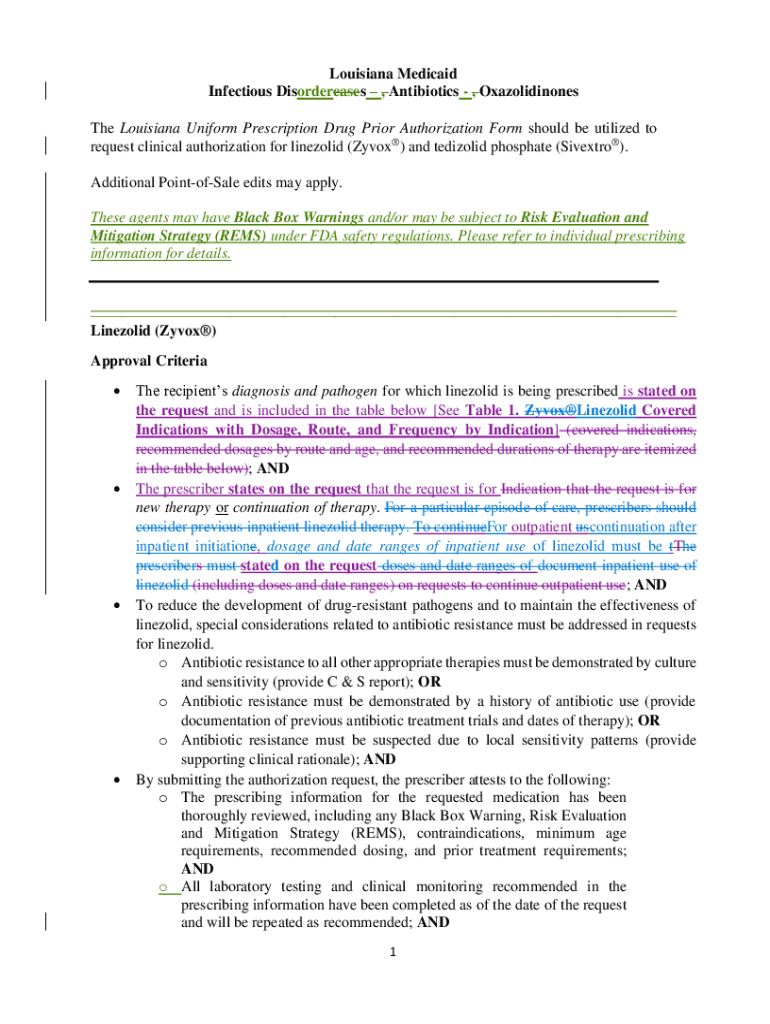 Louisiana Medicaid Infectious Disorder eases , Antibiotics , Oxazolidinones The Louisiana Uniform Prescription Drug Prior Authorization Form should be utilized to request clinical authorization for