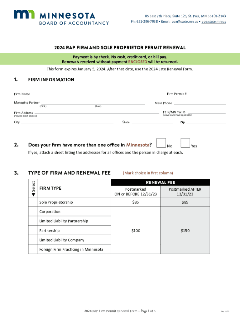 B O A R D O F A C C O U N TA N C Y85 East 7th Place, Suite 125, St. Paul, MN 551012143 Ph: 6512967938 Email: boa@state.mn.us boa.state.mn.us2024 RAP FIRM AND SOLE PROPRIETOR PERMIT RENEWALINSTRUCTIONSALL