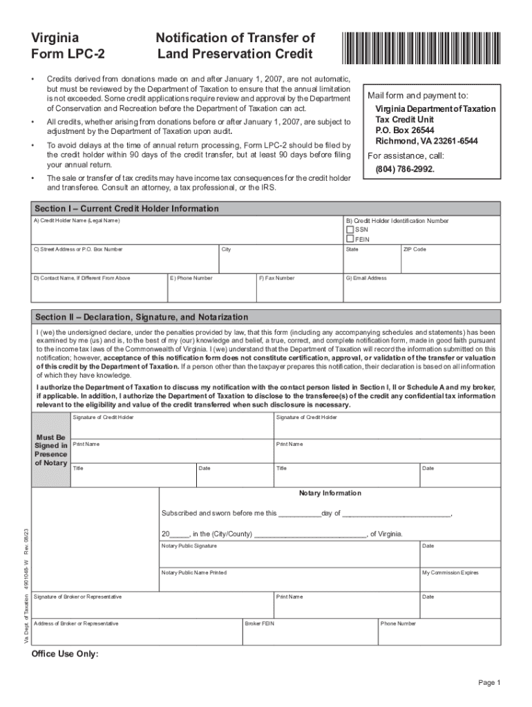 Virginia Form LPC2 Notification of Transfer of Land Preservation Credit×VALPC2123888×Credits derived from donations made on and after January 1, 2007, are not automatic, but must be reviewed by