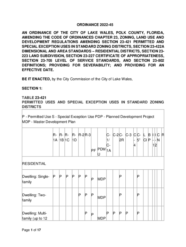 ORDINANCE 202245 AN ORDINANCE OF THE CITY OF LAKE WALES, POLK COUNTY, FLORIDA, AMENDING THE CODE OF ORDINANCES CHAPTER 23, ZONING, LAND USE AND DEVELOPMENT REGULATIONS AMENDING SECTION 23421 PERMITTED