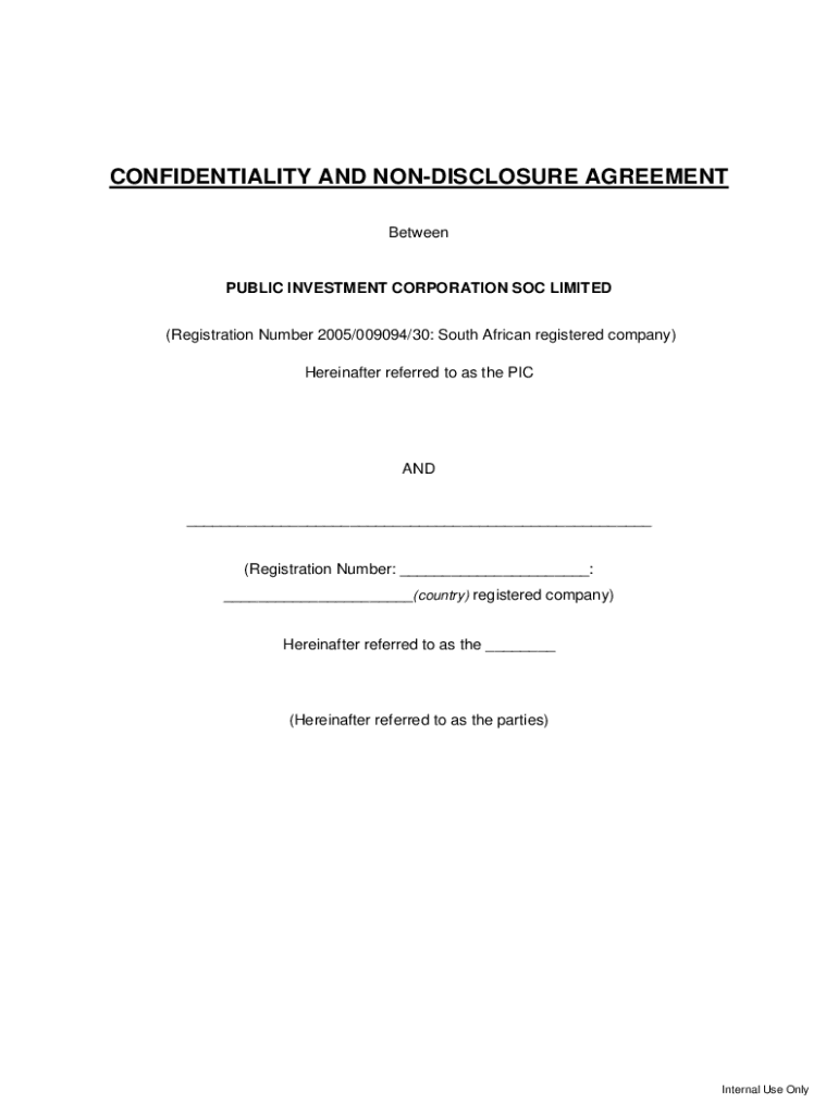 CONFIDENTIALITY AND NONDISCLOSURE AGREEMENT BetweenPUBLIC INVESTMENT CORPORATION SOC LIMITED (Registration Number 2005/009094/30: South African registered company) Hereinafter referred to as the PIC