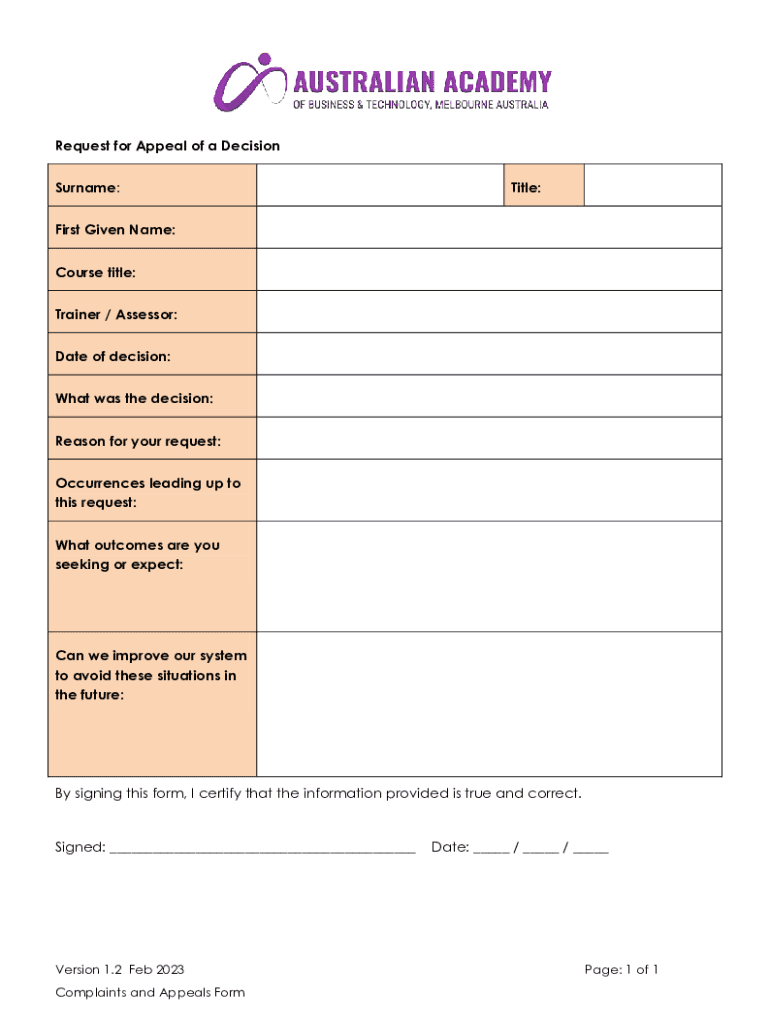 Request for Appeal of a Decision Surname:Title:First Given Name: Course title: Trainer / Assessor: Date of decision: What was the decision: Reason for your request: Occurrences leading up to this