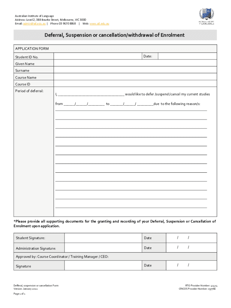 Australian Instute of Language Address: Level 2, 388 Bourke Street, Melbourne, VIC 3000 Email: admin@ail.edu.au | Phone 03 9670 8868 | Web: www.ail.edu.auDeferral, Suspension or cancellation/withdrawal