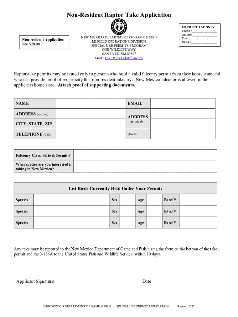 Nonresident Raptor Take Application FOR DEPT. USE ONLY Check #___ Amount___ Date___/___/___ Initials___NEW MEXICO DEPARTMENT OF GAME & FISH LE FIELD OPERATIONS DIVISION SPECIAL USE PERMITS PROGRAM