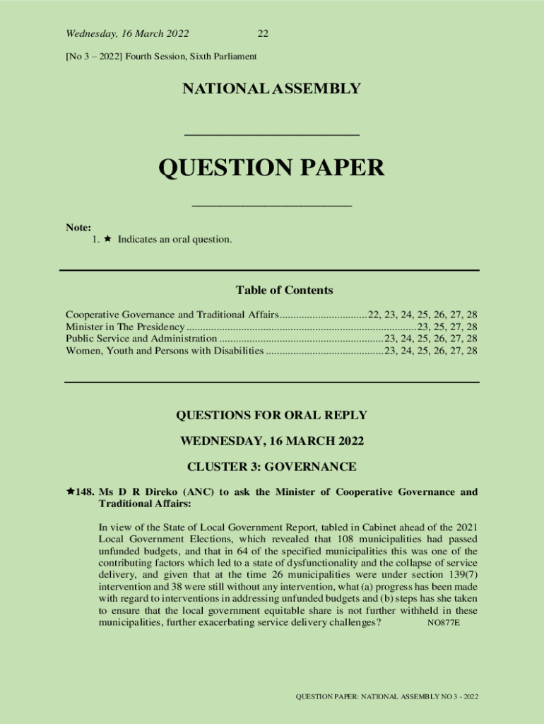 Wednesday, 16 March 202222[No 3 2022] Fourth Session, Sixth ParliamentNATIONAL ASSEMBLY ___QUESTION PAPER ___ Note: 1. Indicates an oral question. Table of Contents Cooperative Governance and Traditional