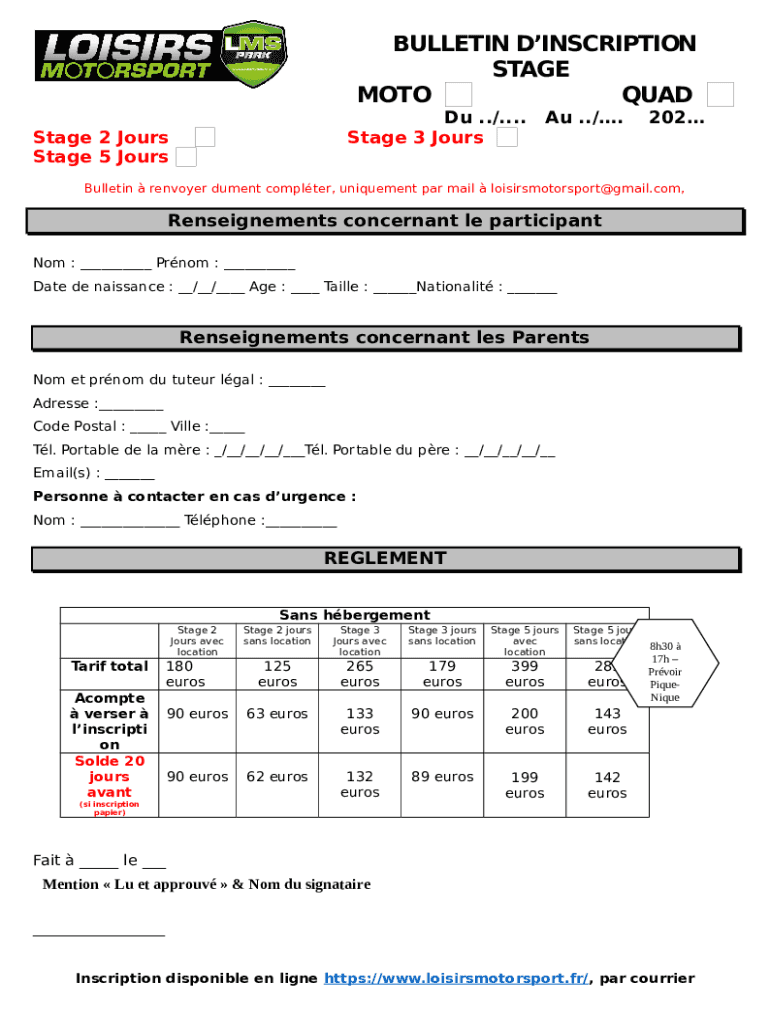 Instructions for the BULLETIN D'INSCRIPTION STAGE form