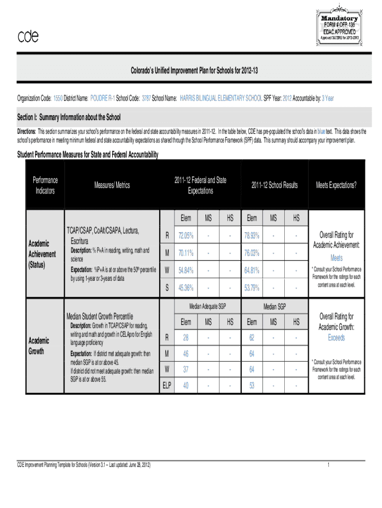 Colorado's Unified Improvement Plan for Schools for 201213 Organization Code: 1550 District Name: PURE R1 School Code: 3787 School Name: HARRIS BILINGUAL ELEMENTARY SCHOOL SPF Year: 2012 Accountable