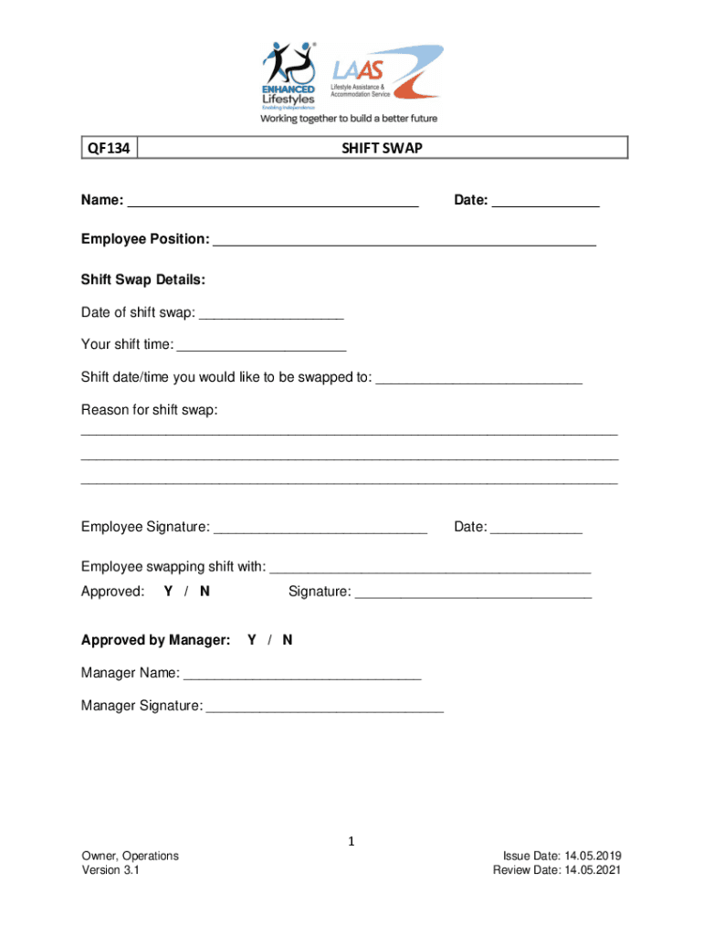 QF134SHIFT SWAPName: ___Date: ___Employee Position: ___ Shift Swap Details: Date of shift swap: ___ Your shift time: ___ Shift date/time you would like to be swapped to: ___ Reason for shift swap: