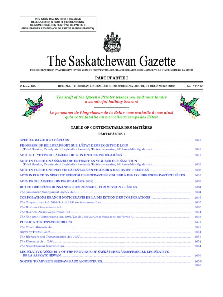 THIS ISSUE HAS NO PART II (REVISED REGULATIONS) or PART III (REGULATIONS)/ CE NU MRO NE CONTENT PAS DE PARTIES II (ELEMENTS RV ISS) OF DE PARTIES III (ELEMENTS)The Saskatchewan GazettePUBLISHED WEEKLY