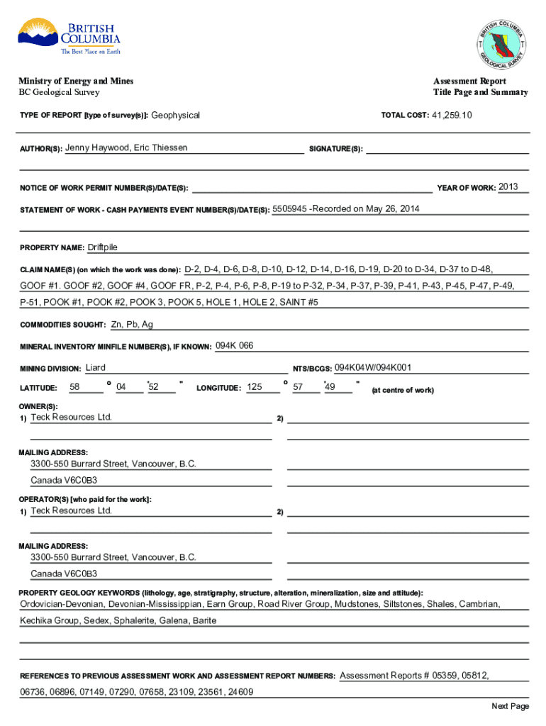 Ministry of Energy and Mines BC Geological SurveyAssessment Report Title Page and SummaryTYPE OF REPORT [type of survey(s)]:AUTHOR(S):GeophysicalTOTAL COST:Jenny Haywood, Eric Thiessen41,259.10SIGNATURE(S):NOTICE