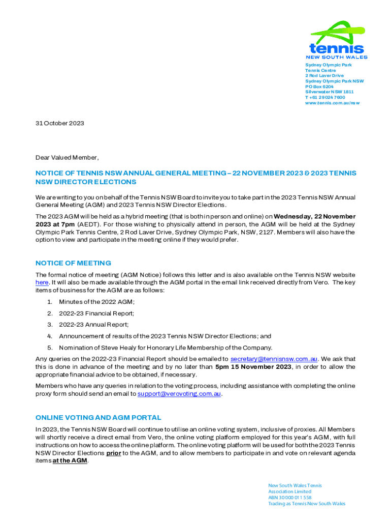 Sydney Olympic Park Tennis Centre 2 Rod Laver Drive Sydney Olympic Park NSW PO Box 6204 Silverwater NSW 1811 T +61 2 9024 7600 www.tennis.com.au/nsw31 October 2023Dear Valued Member,NOTICE OF TENNIS