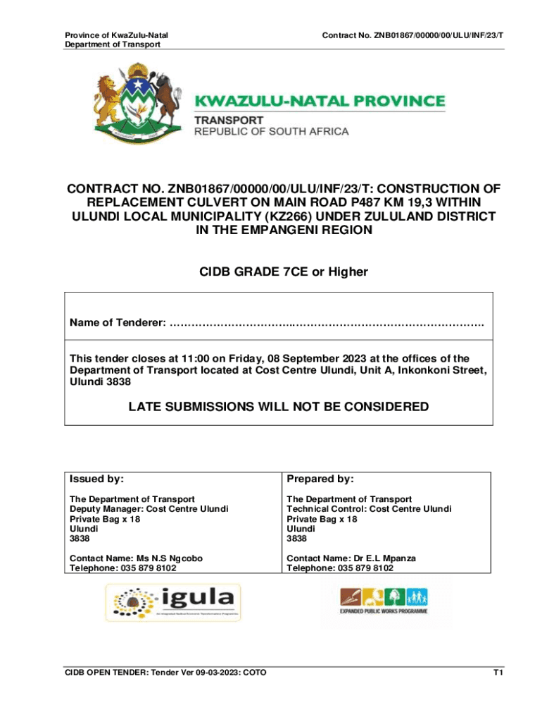Province of KwaZuluNatal Department of TransportContract No. ZNB01867/00000/00/FLU/INF/23/CONTRACT NO. ZNB01867/00000/00/FLU/INF/23/T: CONSTRUCTION OF REPLACEMENT CULVERT ON MAIN ROAD P487 KM 19,3