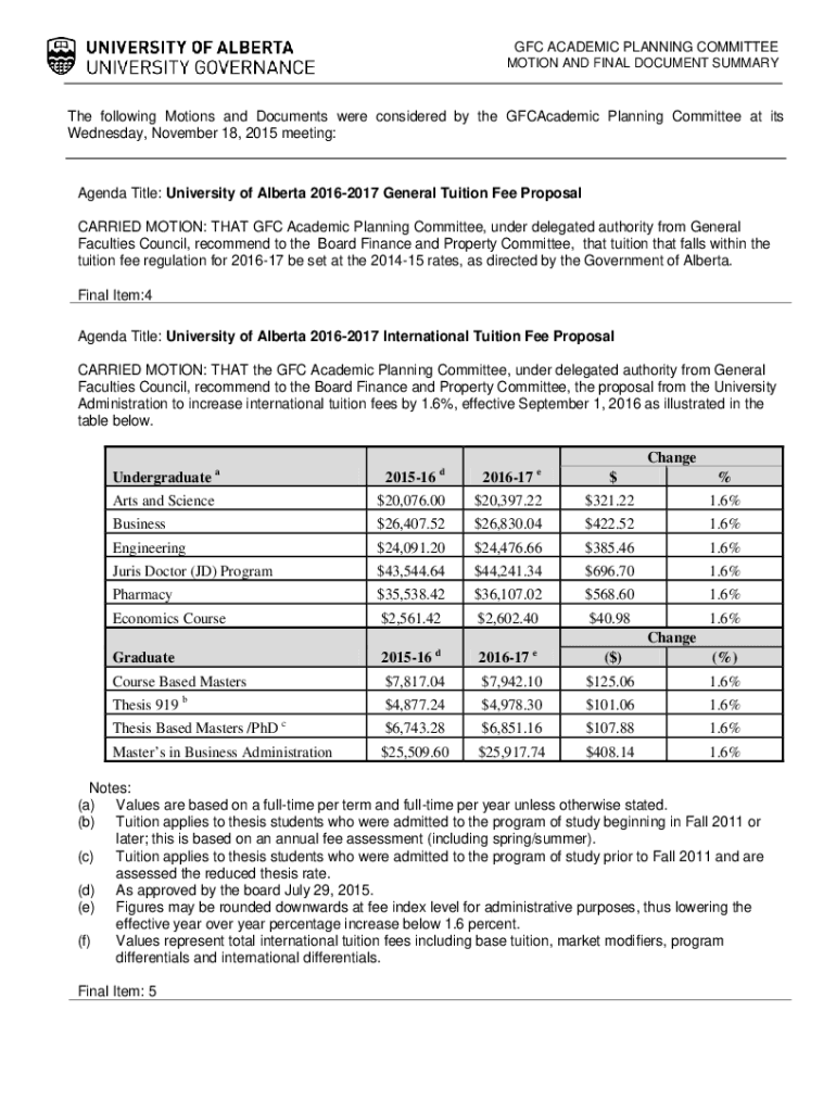 GFC ACADEMIC PLANNING COMMITTEE MOTION AND FINAL DOCUMENT Summary following Motions and Documents were considered by the Academic Planning Committee at its Wednesday, November 18, 2015, meeting:Agenda
