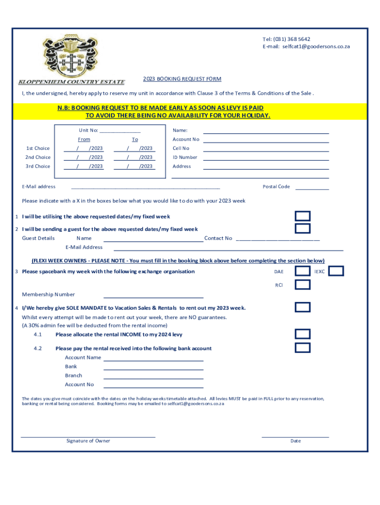 Tel: (031) 368 5642 Email: selfcat1@goodersons.co.za2023 BOOKING REQUEST FORM I, the undersigned, hereby apply to reserve my unit in accordance with Clause 3 of the Terms & Conditions of the Sale.