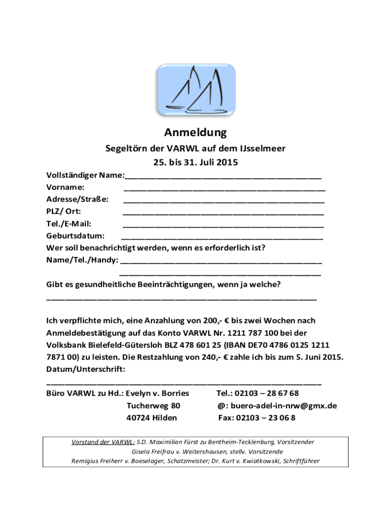 Anmeldung SegeltrnderVARWLaufdemIJsselmeer 25. bis31.Juli2015 VollstndigerName:___ Vorname:___ Adresse/Strae:___ PLZ/Ort:___ Tel./EMail:___ Geburtsdatum: