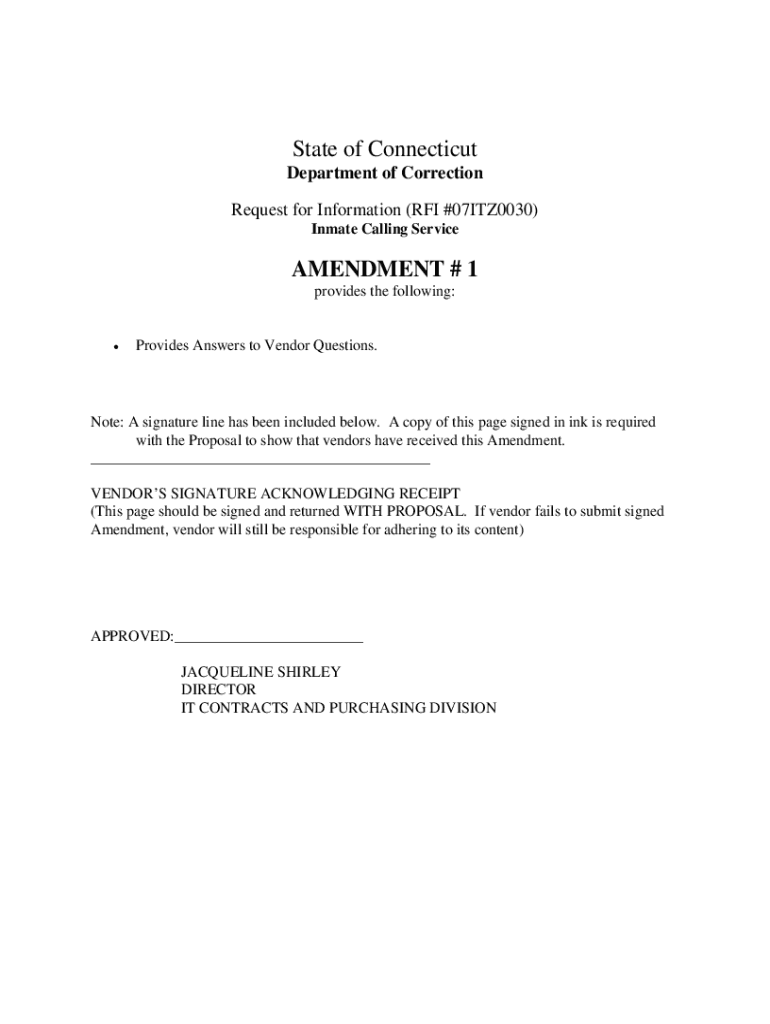 State of Connecticut Department of Correction Request for Information (RFI #07ITZ0030) Inmate Calling ServiceAMENDMENT # 1 provides the following: Provides Answers to Vendor Questions.Note: A signature
