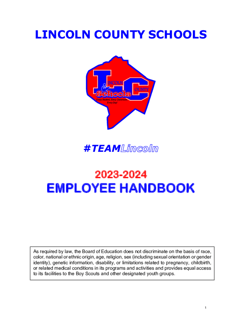 LINCOLN COUNTY SCHOOLS#TEAM20232024EMPLOYEE HANDBOOKAs required by law, the Board of Education does not discriminate on the basis of race, color, national or ethnic origin, age, religion, sex (including