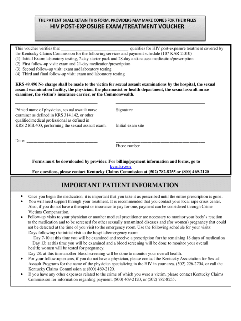THE PATIENT SHALL RETAIN THIS FORM. PROVIDERS MAY MAKE COPIES FOR THEIR FILES HIV POSTEXPOSURE EXAM/TREATMENT Vouchers voucher verifies that ___ qualifies for HIV postexposure treatment covered by