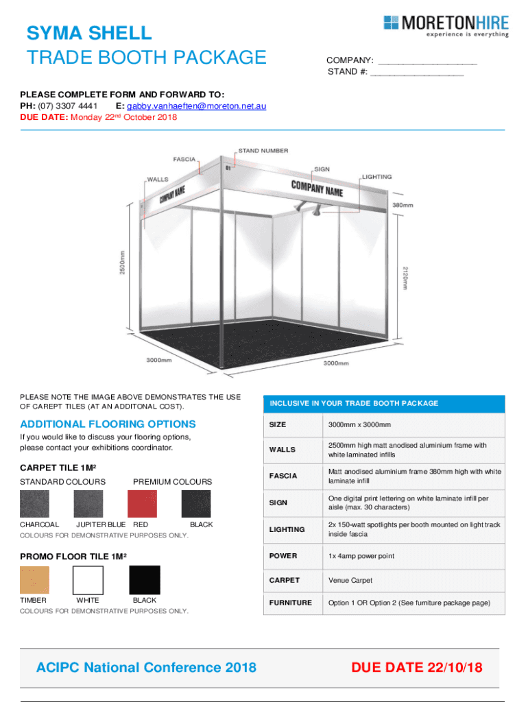 SMA SHELL TRADE BOOTH PACKAGECOMPANY: ___ STAND #: ___PLEASE COMPLETE FORM AND FORWARD TO: PH: (07) 3307 4441 E: gabby.vanhaeften@moreton.net.au ND DUE DATE: Monday 22 October 2018PLEASE NOTE THE