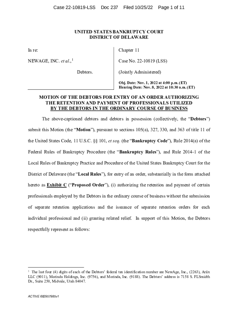 Case 2210819LSSDoc 237Filed 10/25/22Page 1 of 11UNITED STATES BANKRUPTCY COURT DISTRICT OF DELAWARE In re:Chapter 11NEWAGE, INC. et al., 1Case No. 2210819 (LESS) Debtors.(Jointly Administered) Obj.