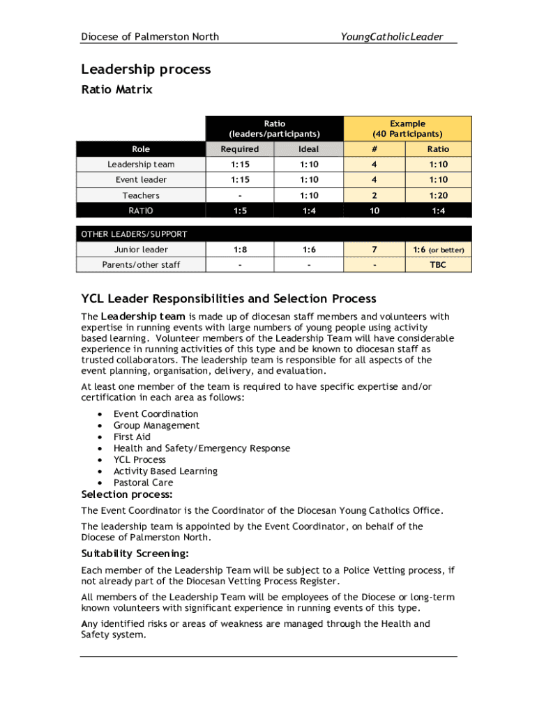 Diocese of Palmerston NorthYoungCatholicLeaderLeadership process Ratio Matrix Ratio (leaders/participants)Example (40 Participants)RoleRequiredIdeal#RatioLeadership team1:151:1041:10Event leader1:151:1041:10Teachers1:1021:20RATIO1:51:4101:4Junior