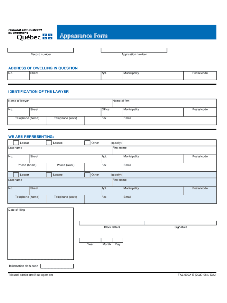 Appearance Form Record numberApplication numberADDRESS OF DWELLING IN QUESTION No.StreetApt.MunicipalityPostal codeIDENTIFICATION OF THE LAWYER Name of lawyer No.Name of firm StreetTelephone (home)Telephone
