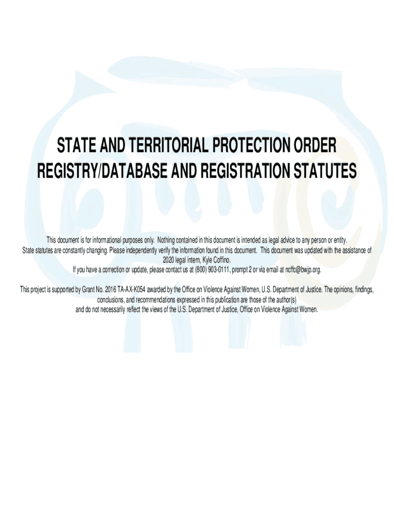 STATE AND TERRITORIAL PROTECTION ORDER REGISTRY/DATABASE AND REGISTRATION STATUTESThis document is for informational purposes only. Nothing contained in this document is intended as legal advice to