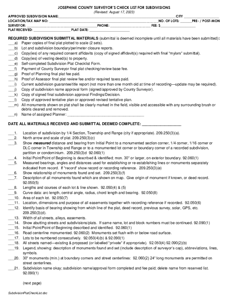 JOSEPHINE COUNTY SURVEYORS CHECK LIST FOR SUBDIVISIONS (Revised: August 17, 2023) APPROVED SUBDIVISION NAME:___CITY ___ LOCATION/TAX MAP NO: ___NO. OF LOTS: ___PRE / POSTMAN SURVEYOR: ___PHONE: ___