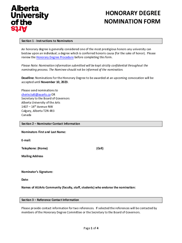 HONORARY DEGREE NOMINATION FORM Section 1 Instructions to Nominators An honorary degree is generally considered one of the most prestigious honors any university can bestow upon an individual; a degree