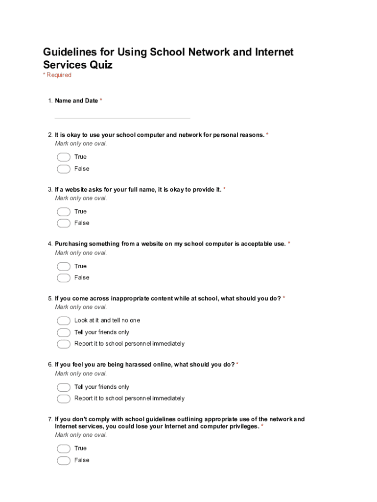 GuidelinesforUsingSchoolNetworkandInternet ServicesQuiz *Required1. NameandDate*2. Itisokaytouseyourschoolcomputerandnetworkforpersonalreasons.* Markonlyoneoval. True False 3. Ifawebsiteasksforyourfullname,