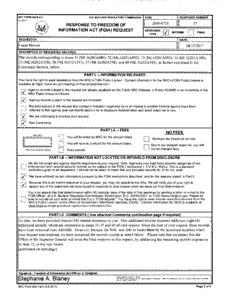 NRC FORM 464 Part IU. S. NUCLEAR REGULATORY COMMISSION(032017)\'RESPONSE TO FREEDOM OF INFORMATION ACT (FOIA) REQUEST.....FOIAIRESPONSE NUMBER2016073 RESPONSE TYPE01711 INTERIMREQUESTER:DATE:Lucas