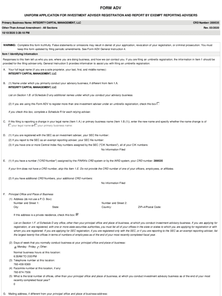 FORM ADV UNIFORM APPLICATION FOR INVESTMENT ADVISER REGISTRATION AND REPORT BY EXEMPT REPORTING ADVISERS Primary Business Name: INTEGRITY CAPITAL MANAGEMENT, LLC CRD Number: 289535OtherThanAnnual