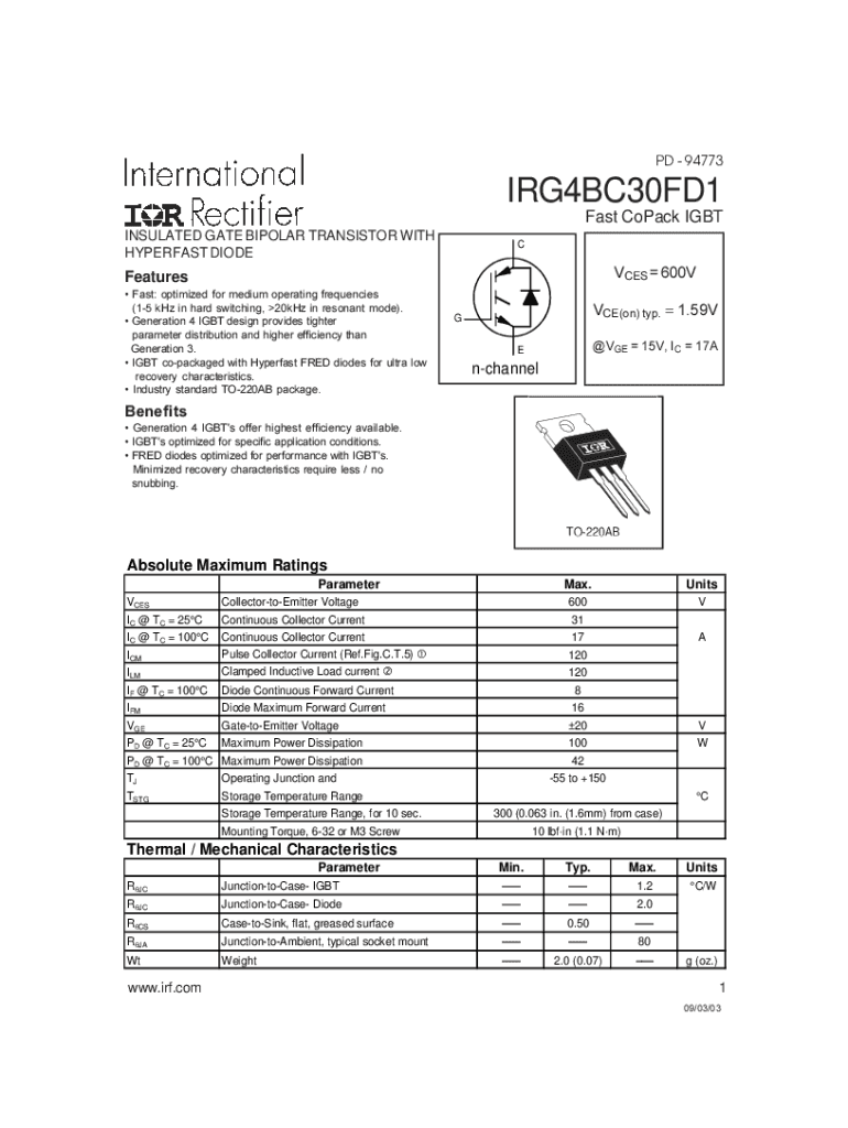 PD 94773IRG4BC30FD1 Fast Coach IGBT INSULATED GATE BIPOLAR TRANSISTOR WITH SUPERFAST DIODECVCES 600VFeatures Fast: optimized for medium operating frequencies (15 kHz in hard switching, 20kHz in resonant