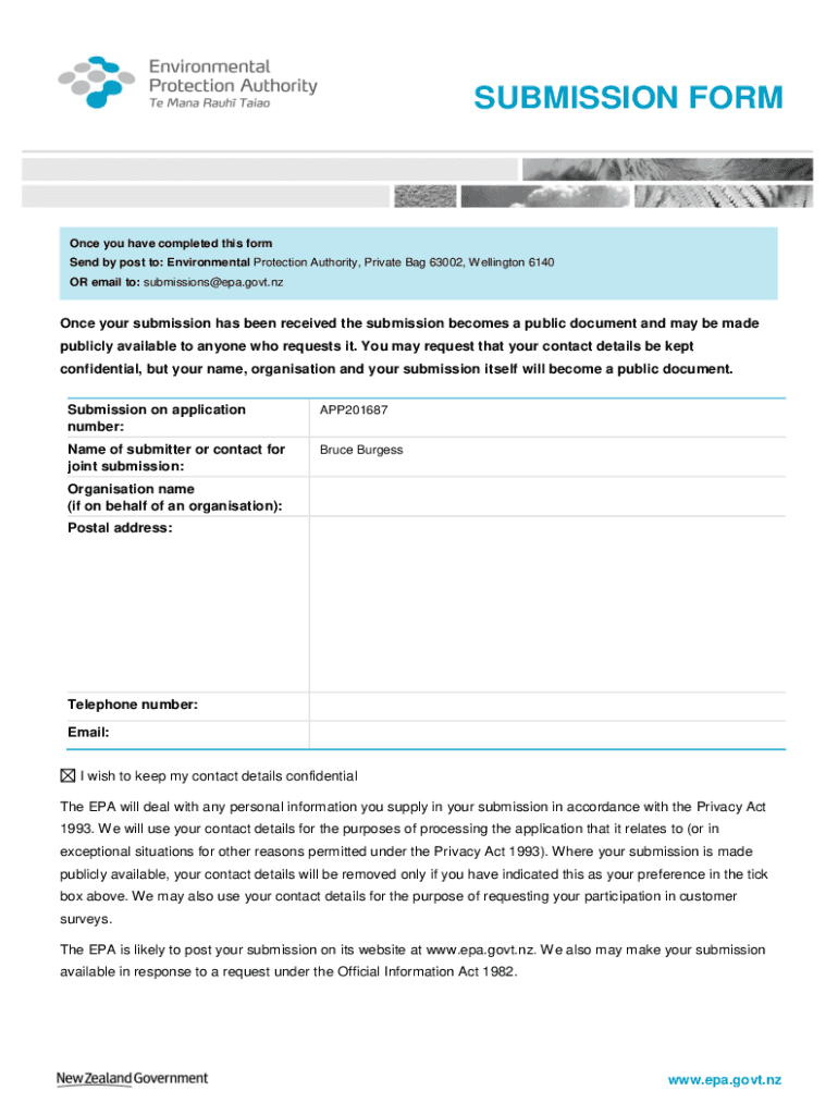 SUBMISSION FORMOnce you have completed this form Send by post to: Environmental Protection Authority, Private Bag 63002, Wellington 6140 OR email to: submissions@epa.govt.nzOnce your submission has