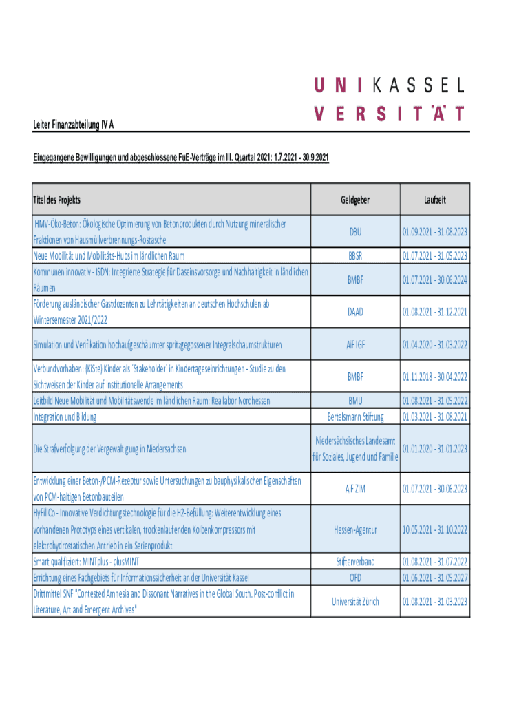 Eingegangene Bewilligungen UND abgeschlossene FuEVertrge I'm III. Quarter 2021: 1.7.2021 30.9.2021Titel DES Projects
