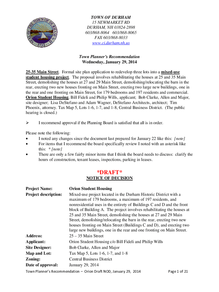 TOWN OF DURHAM 15 NEWMARKET RD DURHAM, NH 038242898 603/8688064 603/8688065 FAX 603/8688033 www.ci.durham.nh.us Town Planners Recommendation Wednesday, January 29, 2014 2535 Main Street. Formal site