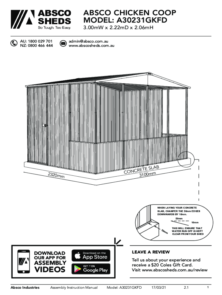 AB SCO CHICKEN COOP MODEL: A30231GKFD 3.00mW x 2.22mD x 2.06mH AU: 1800 029 701 NZ: 0800 466 444admin@absco.com.au www.abscosheds.com.au2320mmLAB RATE S C N O C m 3100mWHEN LAYING YOUR CONCRETE SLAB,