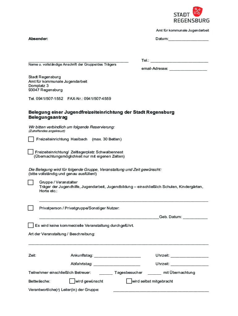 Amt for communal JugendarbeitAbsender:Datum:______Tel.: ___Name u. vollstndige Antichrist her Grippe/DES TrgersemailAdresse: ___ Start Regensburg Amt for communal Jugendarbeit Complete 3 93047 Regensburg
