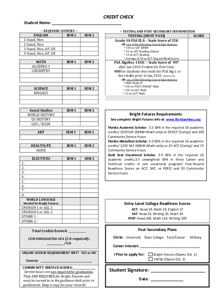 CREDIT CHECKStudent Name: ___ REQUIRED COURSES ENGLISH 1 Stand, Hon 2 Stand, Hon 3 Stand, Hon, AP, DE 4 Stand, Hon, AP, DE1. 2. 3. 4. 5. 6. 7. 8.SEM 1SEM 2MATH ALGEBRA 1 GEOMETRYSEM 1SEM 2SCIENCE