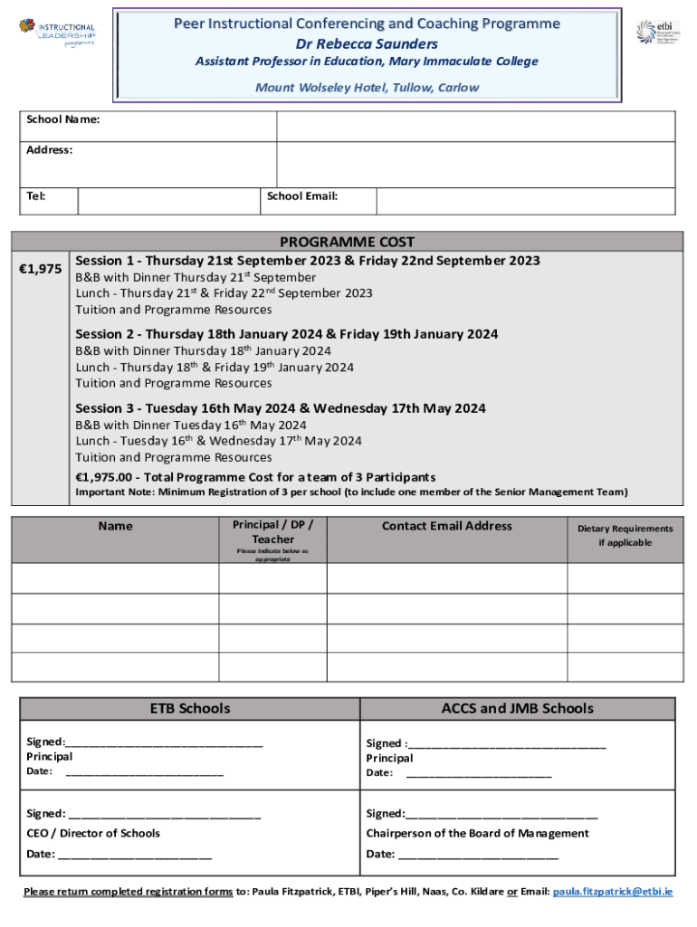 Peer Instructional Conferencing and Coaching Program Dr Rebecca Saunders Assistant Professor in Education, Mary Immaculate College Mount Wolseley Hotel, Tallow, Carlos School Name: Address: Tel:School