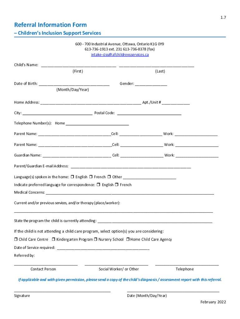 1.7Referral Information Form Children's Inclusion Support Services 600 700 Industrial Avenue, Ottawa, Ontario K1G 0Y9 6137361913 ext. 231 6137368378 (fax) intakeciss@afchildrensservices.caChild\'s