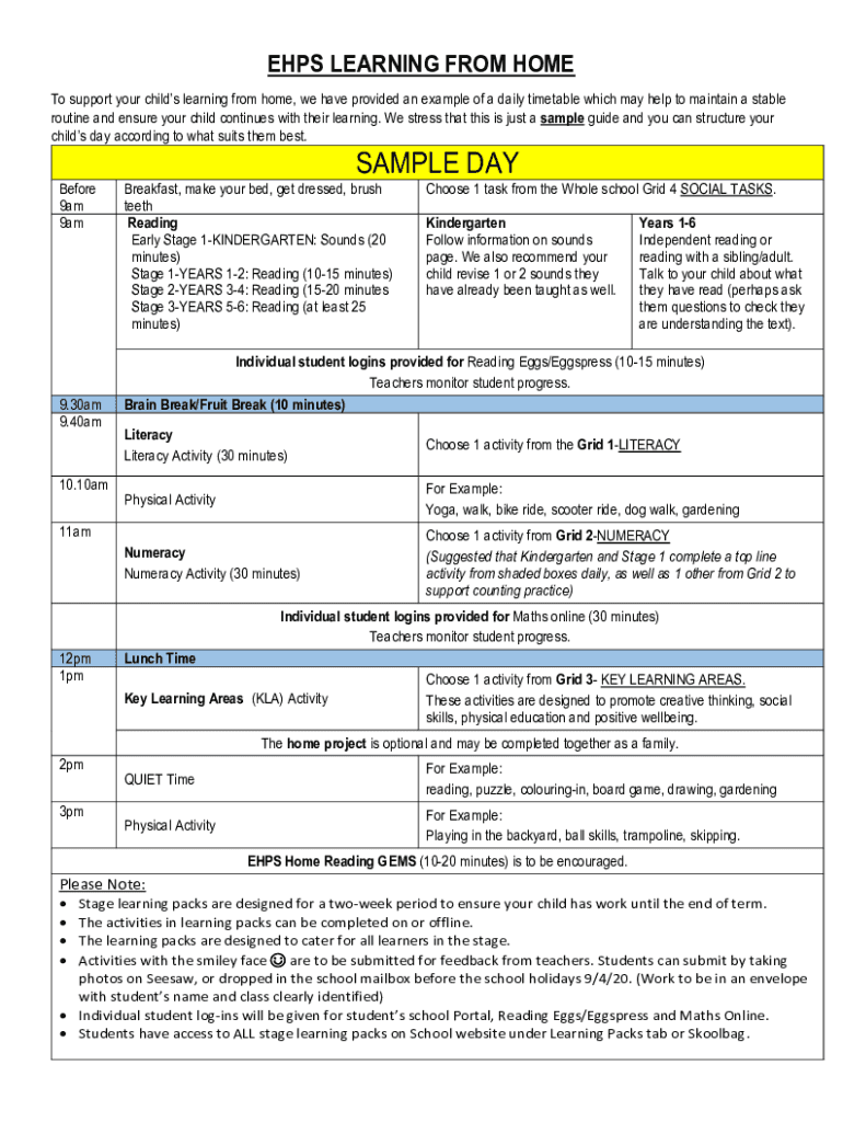 EHPS LEARNING FROM HOME To support your childs learning from home, we have provided an example of a daily timetable which may help to maintain a stable routine and ensure your child continues with