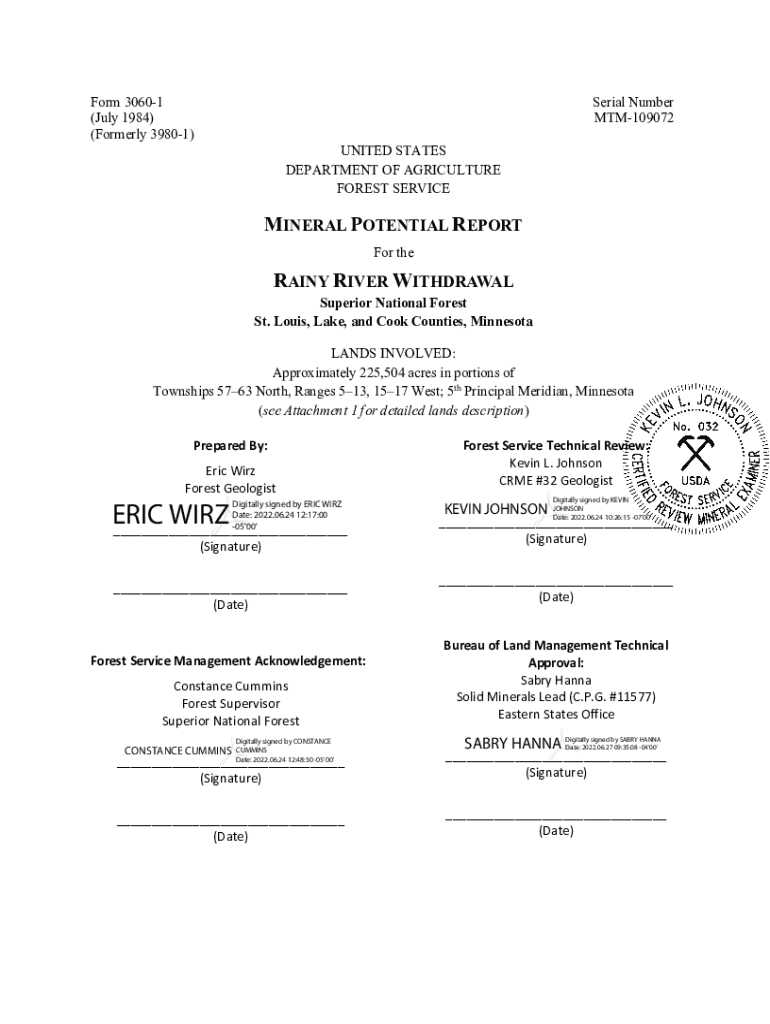 Form 30601 (July 1984) (Formerly 39801)Serial Number MTM109072 UNITED STATES DEPARTMENT OF AGRICULTURE FOREST SERVICEMINERAL POTENTIAL REPORT For theRAINY RIVER WITHDRAWALSuperior National Forest