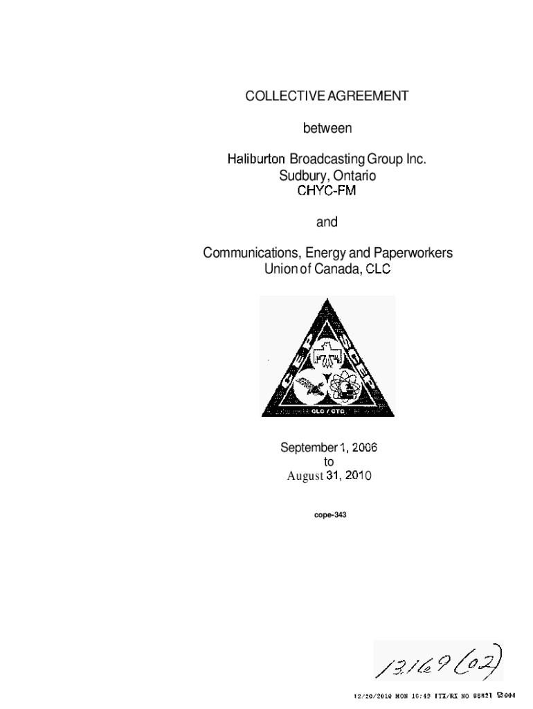 COLLECTIVE AGREEMENTbetween Haliburton Broadcasting Group Inc. Sudbury, Ontario CHYCFM and Communications, Energy and Paperworkers Union of Canada, CLCSeptember I, 2006 to August 31,201O cope34312/20/2010MON