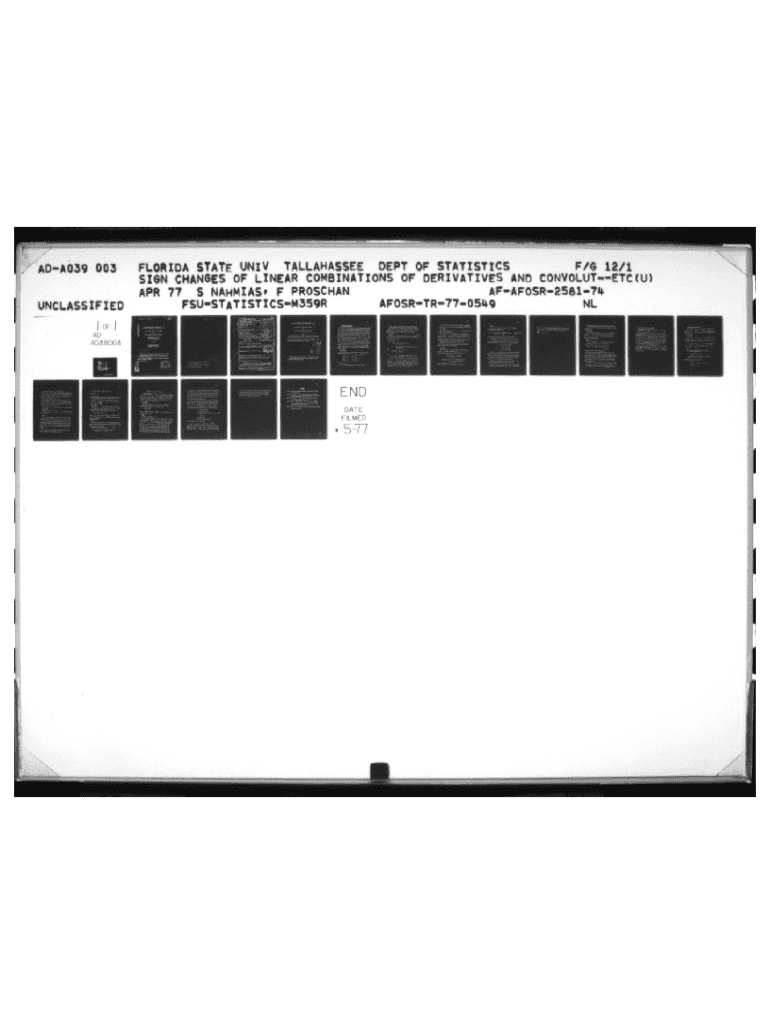 ADA039 003 UNCLASSIFIED/S 12/t FLORIDA STATE UNIV TALLAHASSEE DEPT OF STATISTICS SIGN CHANGES OF LINEAR COMBINATIONS OF DERIVATIVES ANO CONVOLUTED ETC (U) AFAFOSR2561 74 APR 77 S NANNIES F ROSHAN