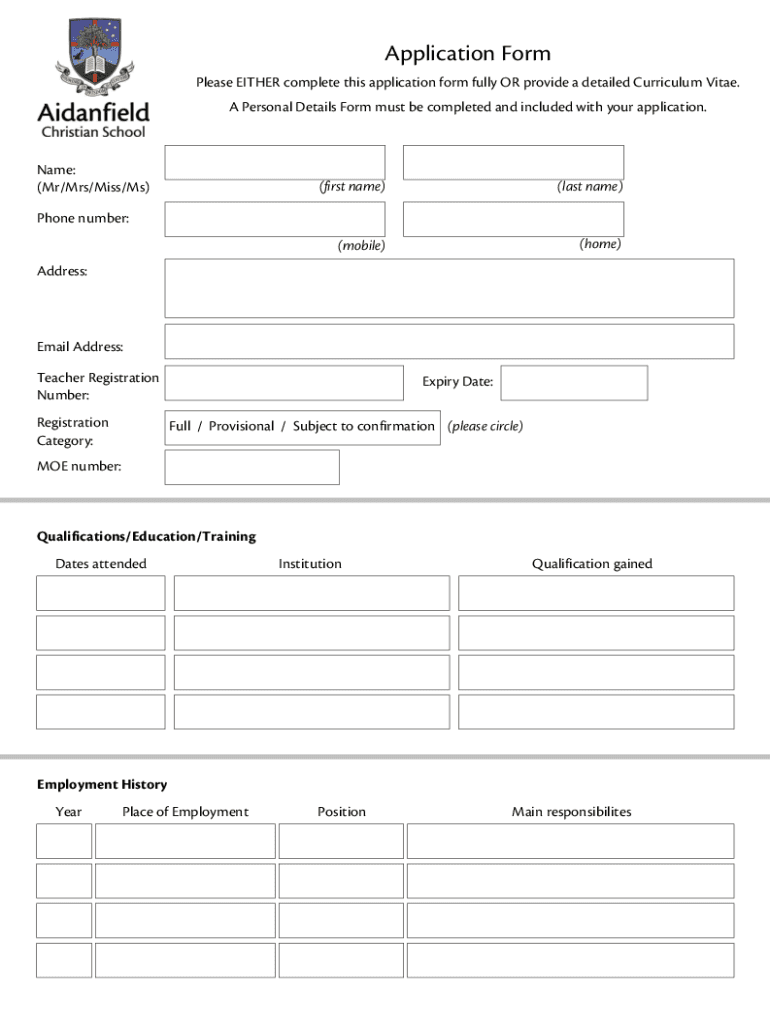 Application Form Please EITHER complete this application form fully OR provide a detailed Curriculum Vitae. A Personal Details Form must be completed and included with your application. Name: (Mr/Mrs/Miss/Ms)(first