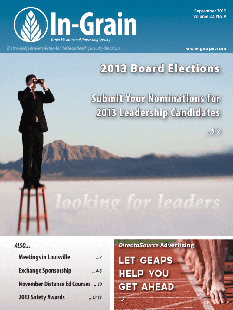 InGrain September 2012 Volume 32, No. 9Grain Elevator and Processing Society Knowledge Resource for the World of Grain Handling Industry Operations w. g e a p s. C o m2013 Board Elections Submit Your