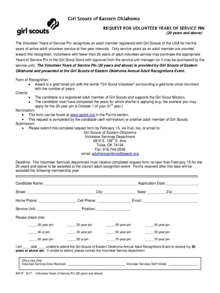 (20 years and above) The Volunteer Years of Service Pin recognizes an adult member registered with Girl Scouts of the USA for her/his years of active adult volunteer service at five year intervals.